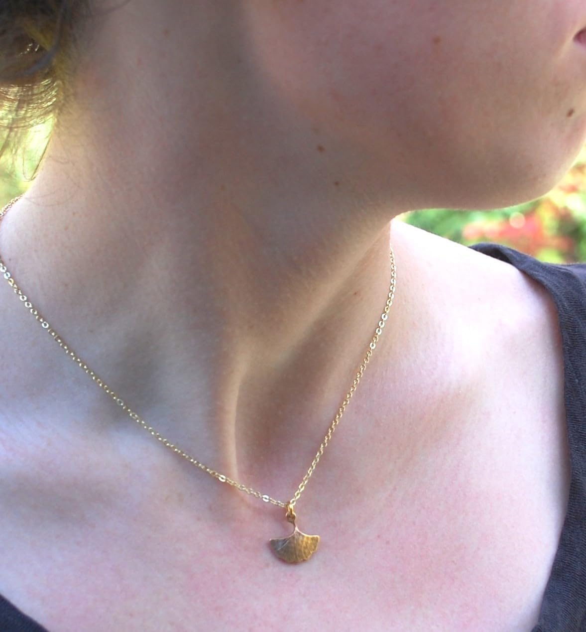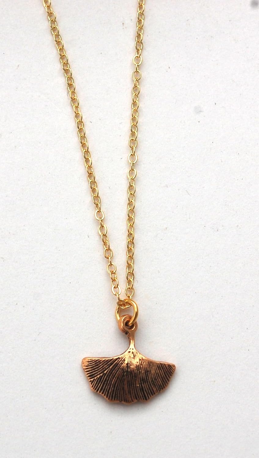 14k gold plated Ginkgo Leaf pendant on 16 inch gold fill chain. Actual length of ginkgo leaf 1/2 inch. Semaki & Bird exclusive. Made in U.S.A. Mounted on tent card with educational message about ginkgos.