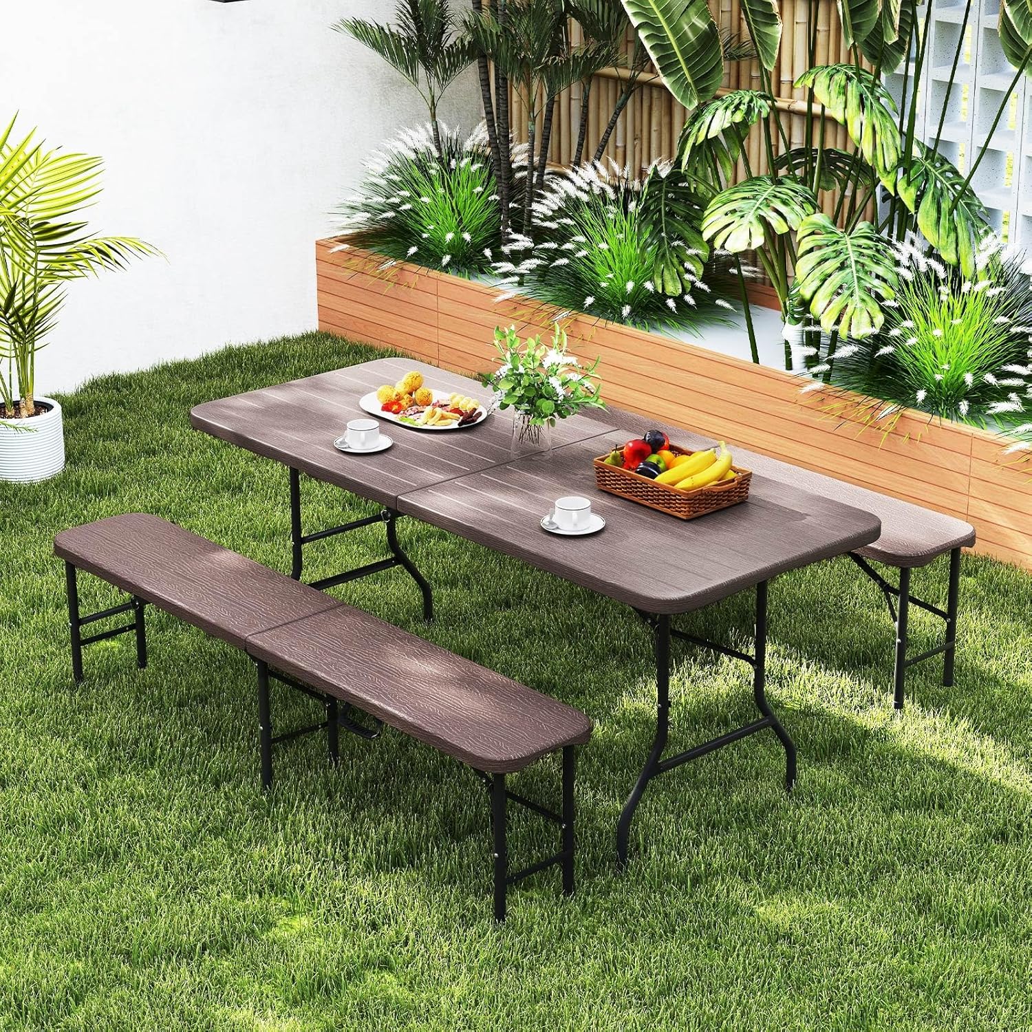 DescriptionExperience convenience with this 6 ft premium HDPE folding bench, designed for ease at any outdoor event.The 1.58” thickened seat is made of premium HDPE which is sunproof, waterproof, and anti-fading for long-lasting outdoor use. With sturdy metal legs and safe locking mechanism, the bench offers strong support up to 1320 lbs. Moreover, the fold-in-half design makes it simple to store and carry. Ideal for picnics, camping, poolside or competitions, the bench seats up to 4, allowing you to relax with your friends. Elevate your outdoor gatherings with this reliable and versatile seating solution.FeatureThickened HDPE seat withstands long-time outdoor useSimple to maintain with the waterproof and smooth bench topLoads up to 1320 lbs with heavy-duty metal frame and joint locksWood-like texture brings more eleganceCompact folding size for space-saving storageFunctional handle for convenient carryingMiddle lock for secure folding and unfoldingAccommodates up to 4 with 6 ft extra-long seatSuitable for picnic, camping, soccer game and so onSpecificationColor: Gray/BrownMaterial: HDPE, MetalOverall Dimension: 71” x 12” x 17” (L x W x H)Folding Dimension: 35.5” x 12” x 3” (L x W x Thickness)Weight Capacity: 1320 lbsNet Weight: 16.5 lbsPackage Includes:1 x Folding Bench1 x Instruction